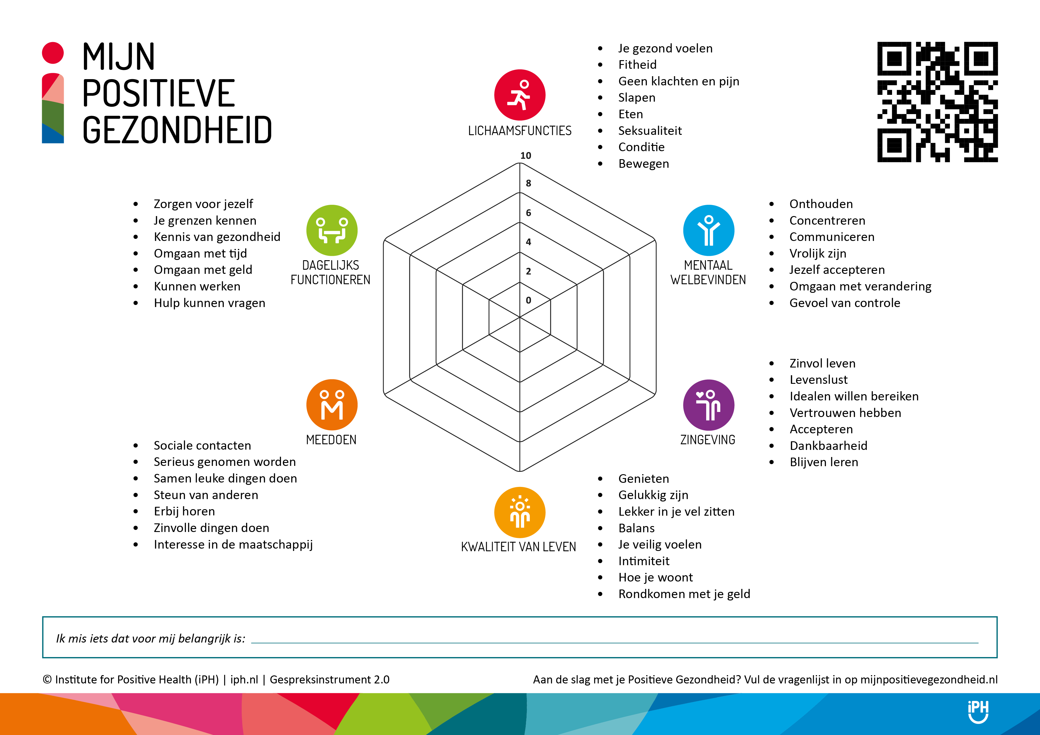 Op de website van IPH (Institute voor Positiv Health) staan vragenlijsten klaar die inzicht geven in jouw positieve gezondheid. De vragenlijsten zijn beschikbaar in meerdere talen: Nederlands, Engels, Duits, Fries. Er zijn vragenlijsten voor kinderen, jongeren en volwassenen. Tenslotte is er een vragenlijst met eenvoudig taalgebruik. Probeer het eens!
